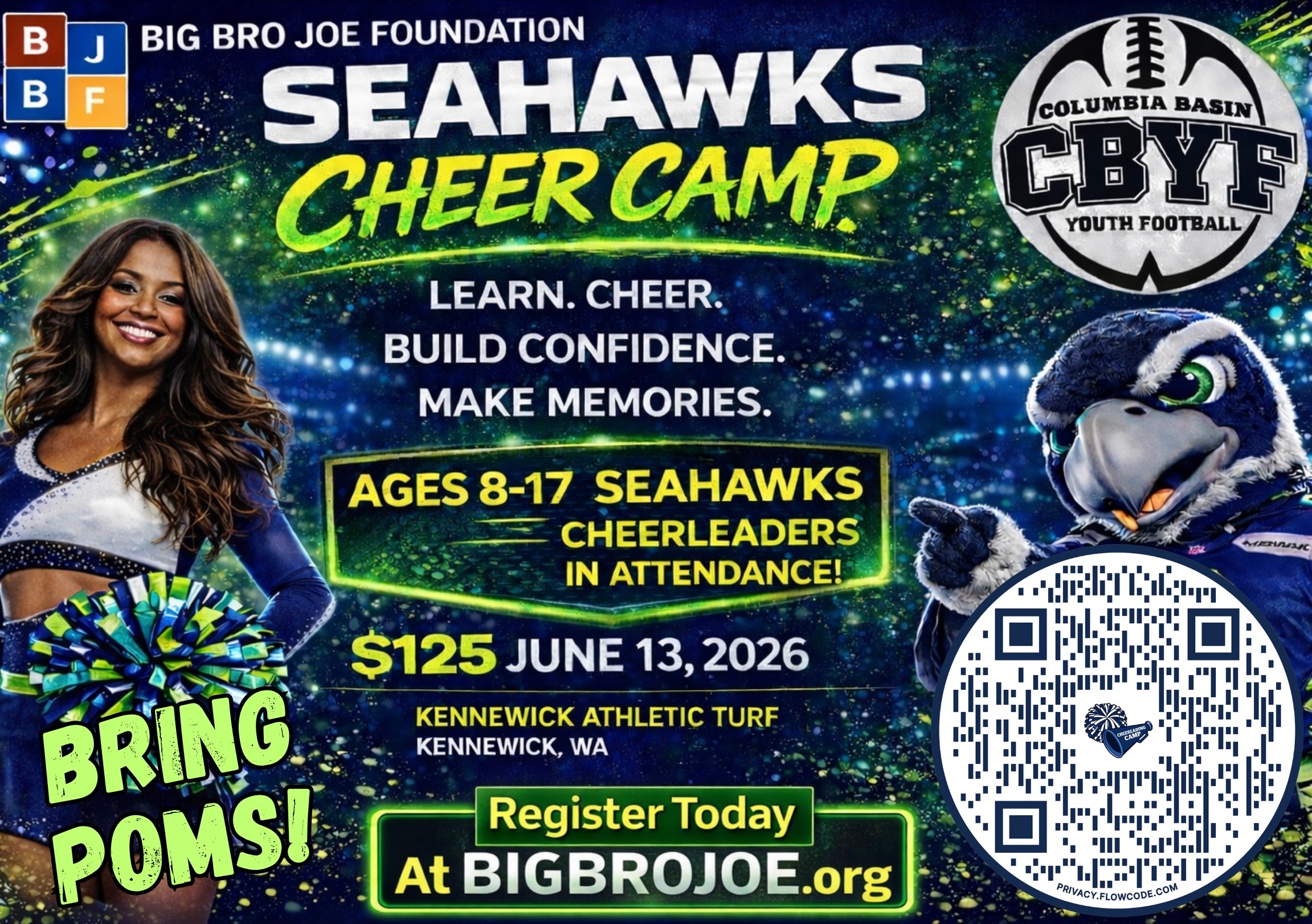 Join the Big Bro Joe Foundation for a high-energy cheer camp where youth can build confidence, learn new skills, and have fun in a positive environment.